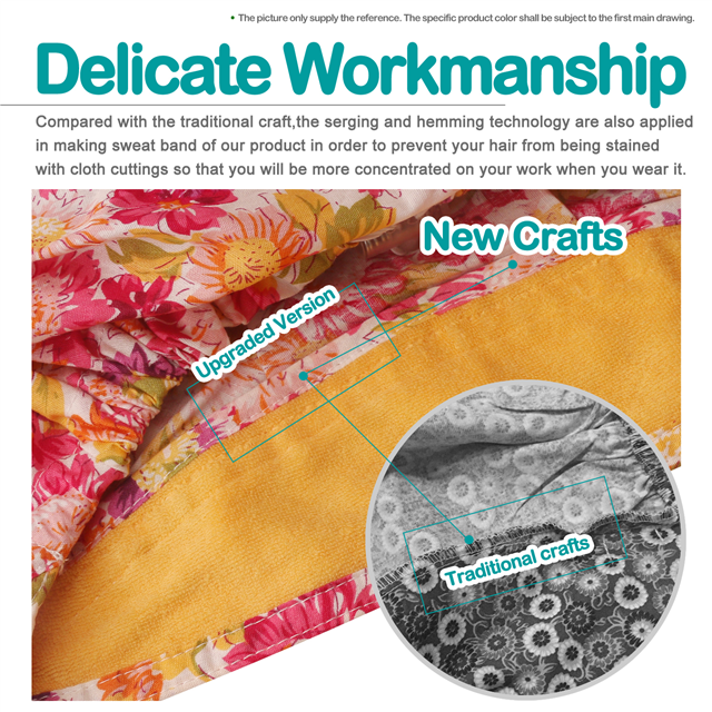4. Built-in sweatband across the front end.Compared with the traditional craft,the serging and hemming technology are also applied in making sweat band of our product in order to prevent your hair from being stained with cloth cuttings so that you will be more concentrated on your work when you wear it.